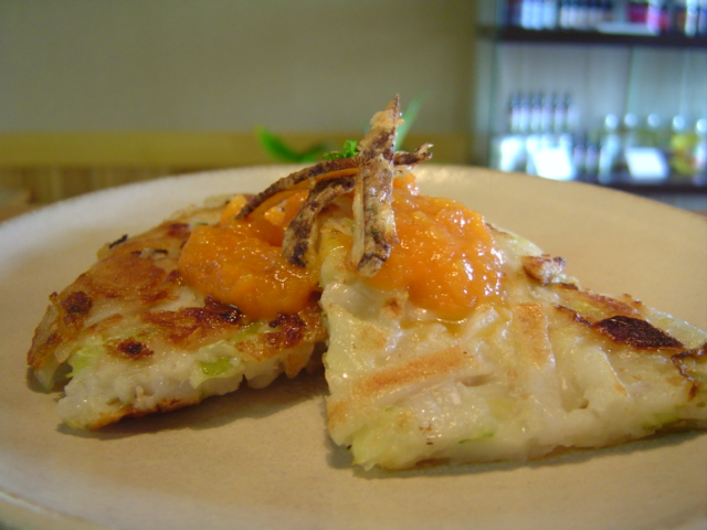 「里芋のガレット」(人参ソースと里芋皮のかき揚げのトッピング)